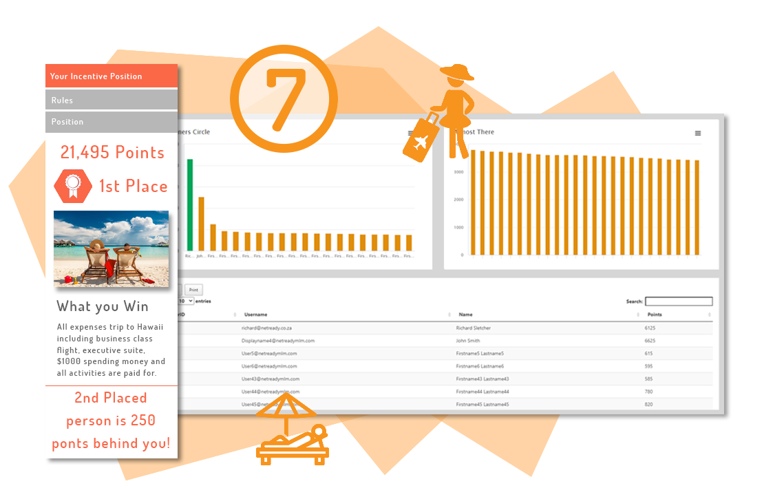 Netready's incentive engine is a beacon of innovation in MLM management. It goes beyond traditional reward systems by providing live updates, fostering a competitive environment that's both engaging and stimulating. This engine not only tracks incentives in real time but also communicates directly with members, keeping them informed of their ranking, how they stack up against the competition, and what they need to do to climb the ranks.